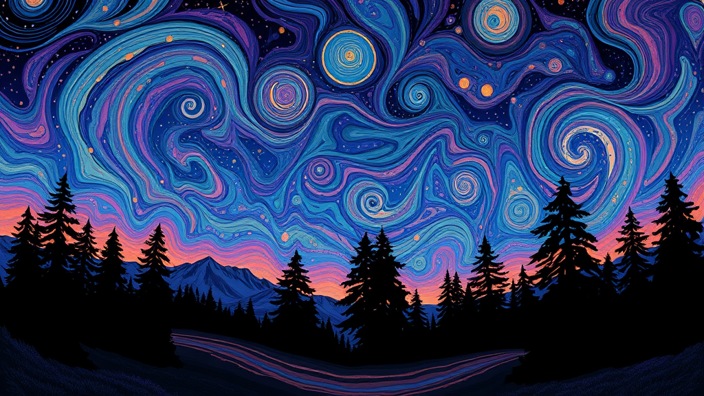 An evening sky adorned with sparkling stars and silhouetted trees, rendered in an intricate psychedelic landscape style, inspired by Martin Ansin and Emily Carr. The artwork features a psychedelic overload with multilayered dimensions and a naturalistic color palette. Swirling vortexes dance across the scene, creating a vibrant tapestry of color and form that captures the ethereal essence of the night sky.