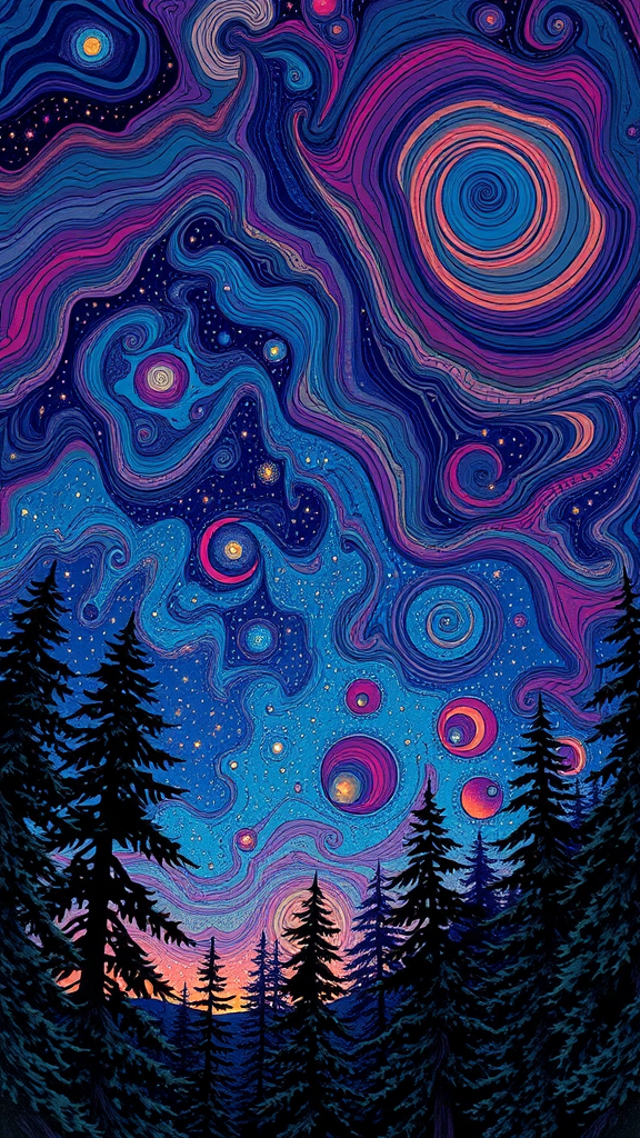 An evening sky filled with twinkling stars framed by trees, depicted in a detailed psychedelic landscape style reminiscent of Martin Ansin and Emily Carr, featuring a psychedelic overload with multilayered dimensions. This scene is rendered in a naturalistic color palette, incorporating swirling vortexes and flowing forms to create a sense of depth and motion. The unique horizon captures an intricate balance between the celestial and terrestrial, with the swirling patterns lending a dreamlike quality to the vibrant, multi-dimensional panorama.