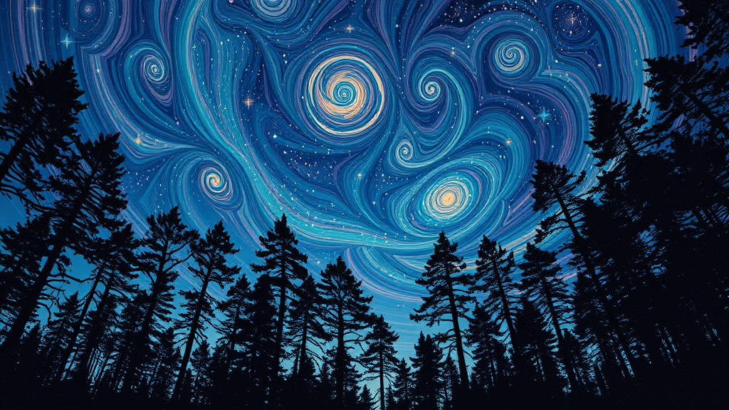 An evening sky filled with twinkling stars, set against a backdrop of towering trees, crafted in the style of intricate psychedelic landscapes. This artwork draws inspiration from Martin Ansin and Emily Carr, featuring a vibrant psychedelic overload with multilayered dimensions. The scene is infused with a naturalistic color palette and swirling vortexes that dance across the sky, creating an enchanting and otherworldly atmosphere.