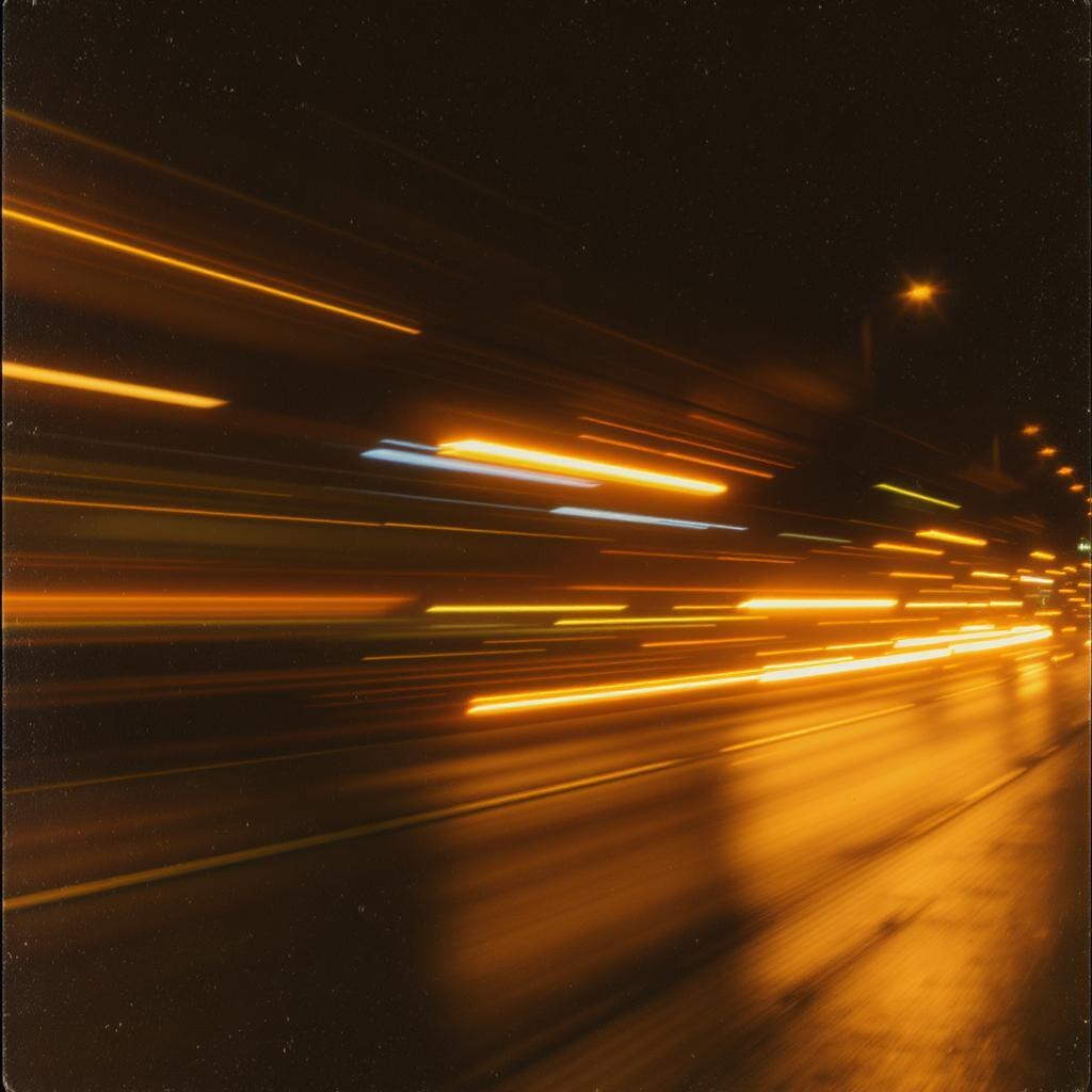 An evocative cinematic abstract photo with pronounced motion blur, showcasing luminous amber and gold streaks dancing across a dimly lit urban environment. The image possesses a nostalgic grainy, film-like texture, with gentle glows and shadowy peripheries. The composition captures movement through dynamic light trails, suggesting transient opulence and artistic spontaneity. Influenced by both vintage photography and contemporary editorial style, it embodies a timeless yet modern elegance.