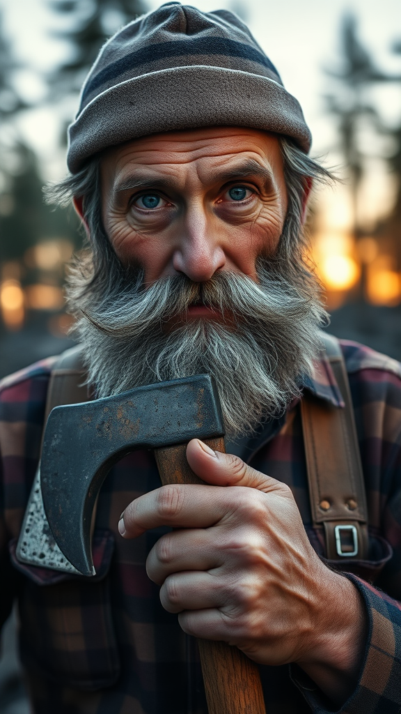 An evocative portrait of a weathered lumberjack, his piercing blue eyes reflecting a lifetime of toil, lit by a soft spotlight that casts gentle shadows across his rugged face. His bushy beard is flecked with silver, and his calloused hands rest on the handle of a worn axe, evidence of a long day spent amidst towering pines. The plaid shirt and suspenders he wears are stained with sweat and wood chips, and the backdrop of dusk settles behind him, hinting at the tranquil forest he calls home.