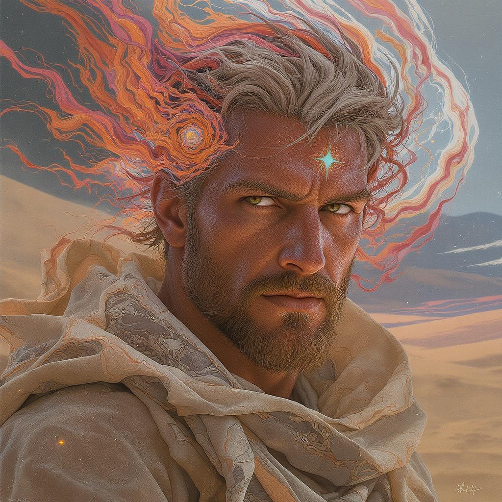 An exceptionally detailed and beautifully painted psychedelic portrait of a rugged male character inspired by Dune, centered and intricate, capturing the styles of Conrad Roset, Greg Rutkowski, and Makoto Shinkai, trending on ArtStation. The image presents a realistic and cinematic quality, with vivid colors and intricate patterns swirling around the character, whose intense gaze and weathered features speak to his strength and resilience. In the background, hints of a fantastical desert landscape are visible, with subtle elements of windblown sand and ethereal lights adding depth and atmosphere. The portrait blends realism with surrealism, creating a mesmerizing and dramatic effect.