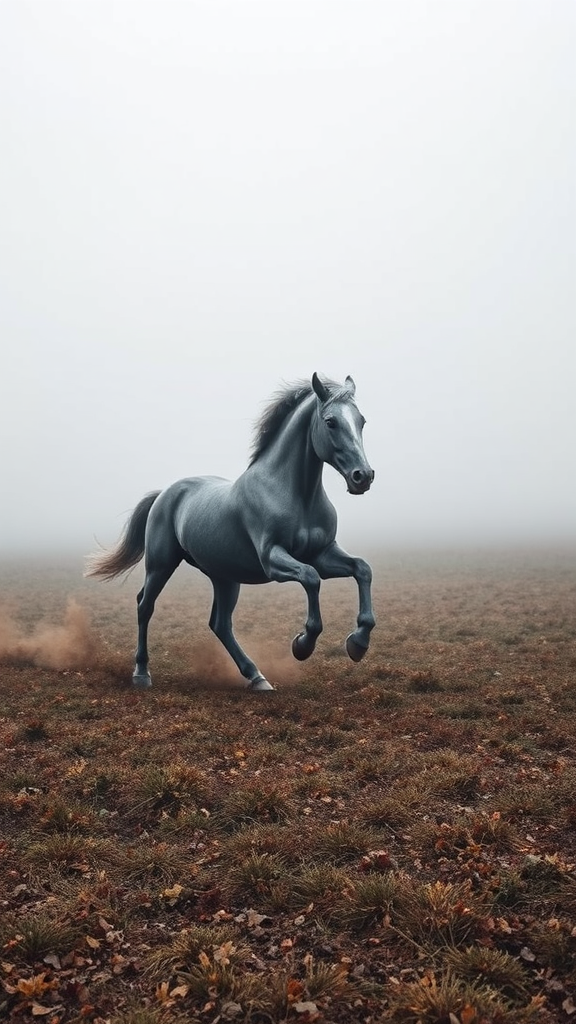 An expansive field shrouded in dense fog, presenting a captivating and dynamic scene. A powerful gray stallion emerges in full gallop, its muscles rippling under its sleek coat. The stallion's mane and tail flow like silken banners, capturing the momentum of its charge. The fog swirls around its hooves, adding a mysterious and ethereal quality to the image. The setting is devoid of trees, emphasizing the timelessness and isolation of the landscape. This epic shot is rendered with exceptional detail, capturing the raw energy and grace of the stallion in motion against an atmospheric backdrop.