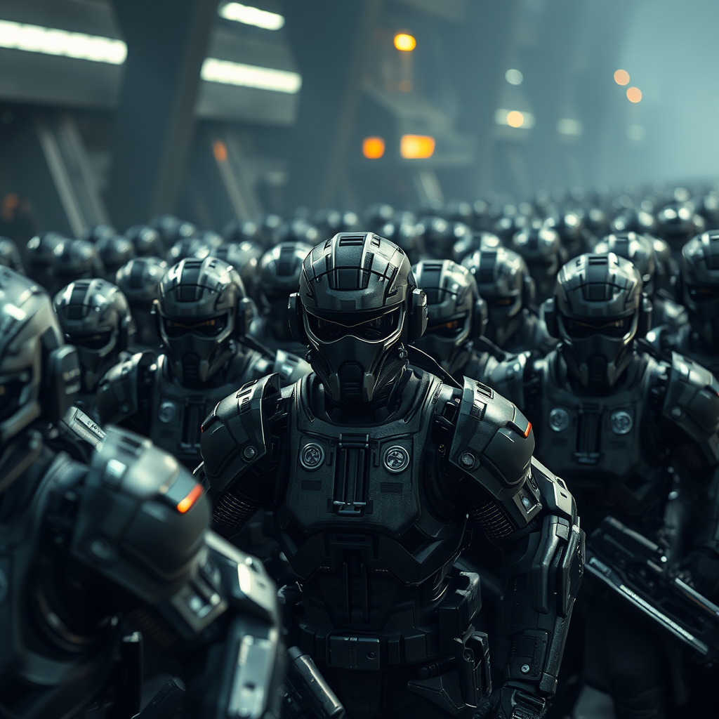 An expansive legion of cybernetic warriors advancing with precision, adorned in dull and steely hues, capturing a photorealistic essence under dramatic cinematic lighting, as seen through the perspective of a wide-angle DSLR lens, adding depth and intensity to the scene.