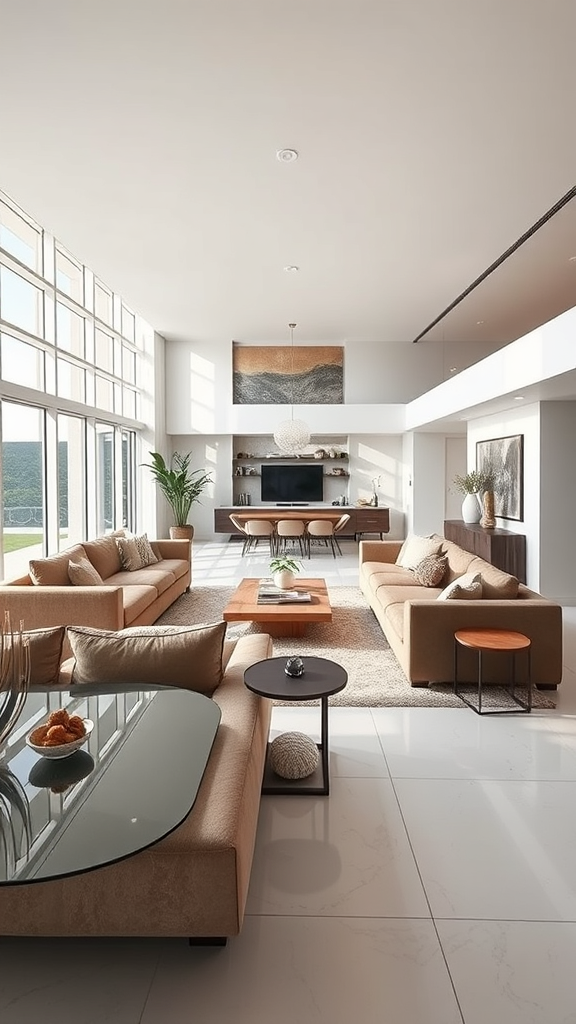 An expansive open-plan living area characterized by strong diagonal lines, offering a sense of spaciousness and fluidity. The design features detailed and lush elements, complemented by a crisp and clean aesthetic. The contemporary DIY touches present a personalized flair, highlighted by sleek glazed surfaces that enhance the modern feel. The room is flooded with natural light, showcasing a meticulously detailed and accurate arrangement. Surfaces are polished and refined, adding to the ambiance of elegance and sophistication, while maintaining an inviting, raw style.