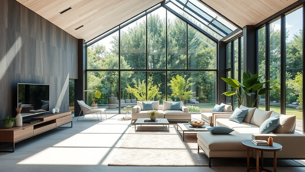 An expansive open plan living space featuring strong diagonal lines and a meticulously detailed, crisp, and clean contemporary DIY aesthetic. The room is adorned with lush textures and glazed surfaces that reflect the abundant natural light streaming in. The design is both stylish and functional, with a focus on precision and accuracy in every detail. The contemporary style is enhanced by the interplay of shadows and light, creating an atmosphere that is both inviting and sophisticated. Pops of greenery and sleek, minimalist furniture complete the look, ensuring a harmonious blend of nature and modernity.