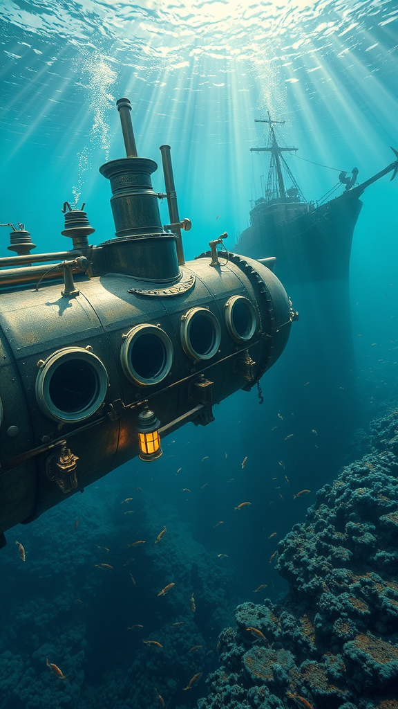 An expansive underwater scene featuring a steampunk-inspired submarine reminiscent of the Nautilus from Jules Verne's imagination, with intricate brass gears and portholes, adorned with ornate copper pipes and glowing lanterns, casting ethereal beams of light into the surrounding azure depths, schools of colorful fish darting around, and a coral-encrusted shipwreck resting serenely in the background, soft rays of sunlight filtering down from the surface, creating a mesmerizing play of light and shadow on the seabed.