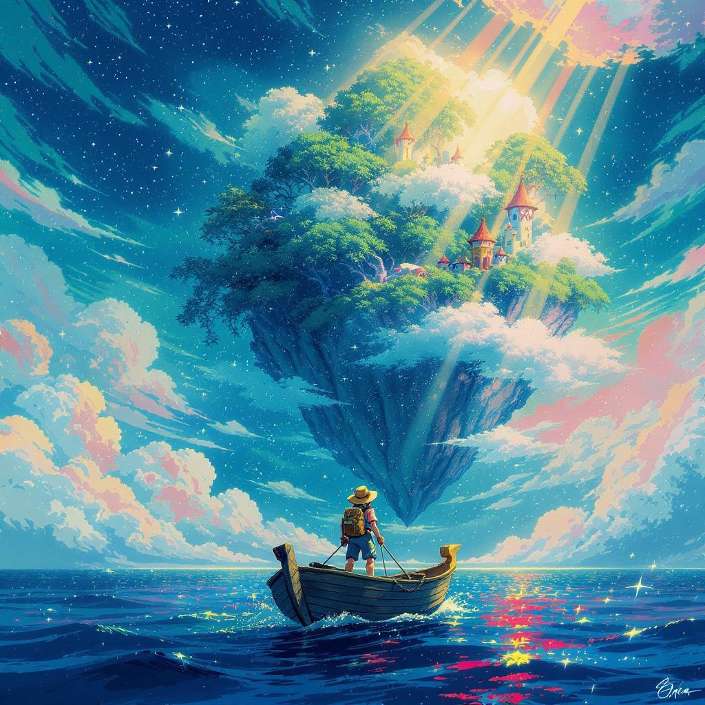 An explorer in a colorful 16-bit pixel art style stands on a boat, awash with wonder, as they approach a mystical island floating majestically among the clouds. The vivid scene, reminiscent of a Studio Ghibli cinematic masterpiece, captures the enchanting interplay of light and shadow, evoking an epic sense of discovery. The sky is painted in rich blues and pinks of dawn, with sunlight scattering to create a high dynamic range effect that enhances the dreamlike atmosphere. Lush greenery and whimsical structures peek through the mist, promising adventure and secrets.
