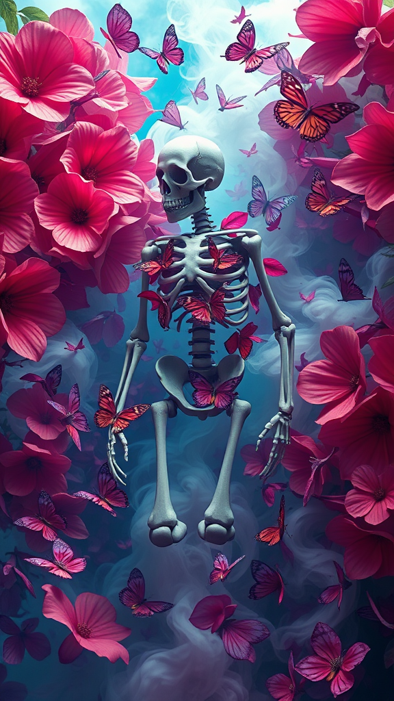 An explosion of vibrant flowers unfolds in a dreamlike DMT style, with ultra-realistic 3D rendering capturing the essence of each petal and leaf. A skeletal figure emerges, wrapped in 'Fluid Fragments', as it seamlessly morphs through an array of abstract crimson and purple compositions. Each transformation elegantly defies traditional definitions, surprising the senses. All is brought to life in Unreal Engine 5, where the hyper-realism is palpable. The rich scent of mud mingles with the metallic hint of crushed bones, while butterflies flutter amidst swirls of ethereal smoke, creating a surreal symphony of movement and aroma.