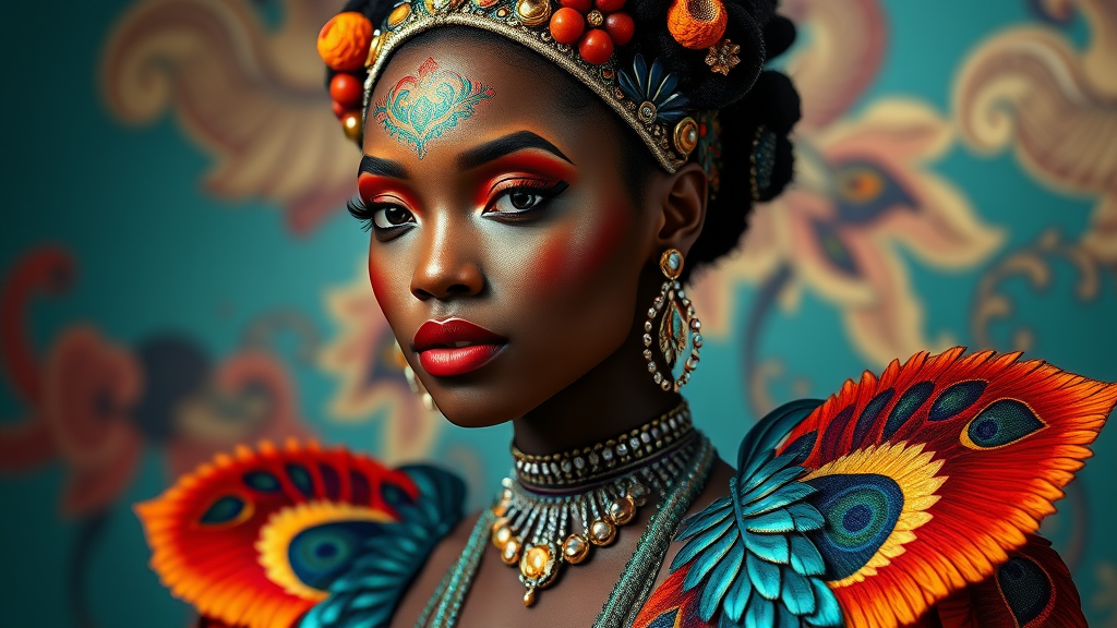 An exquisite art deco Afro-Caribbean model showcasing a dynamic art deco-inspired gown blending peacock motifs with sari elements, captured in a highly detailed studio portrait. Her face displays intricate art reminiscent of Sylvain Chomet’s style, with influences drawn from the vibrant palettes and character design of Team Fortress 2 and Breath of the Wild. The scene is meticulously rendered in 8k using octane, highlighting an inventive use of color theory that intertwines ornate details with a modern twist.