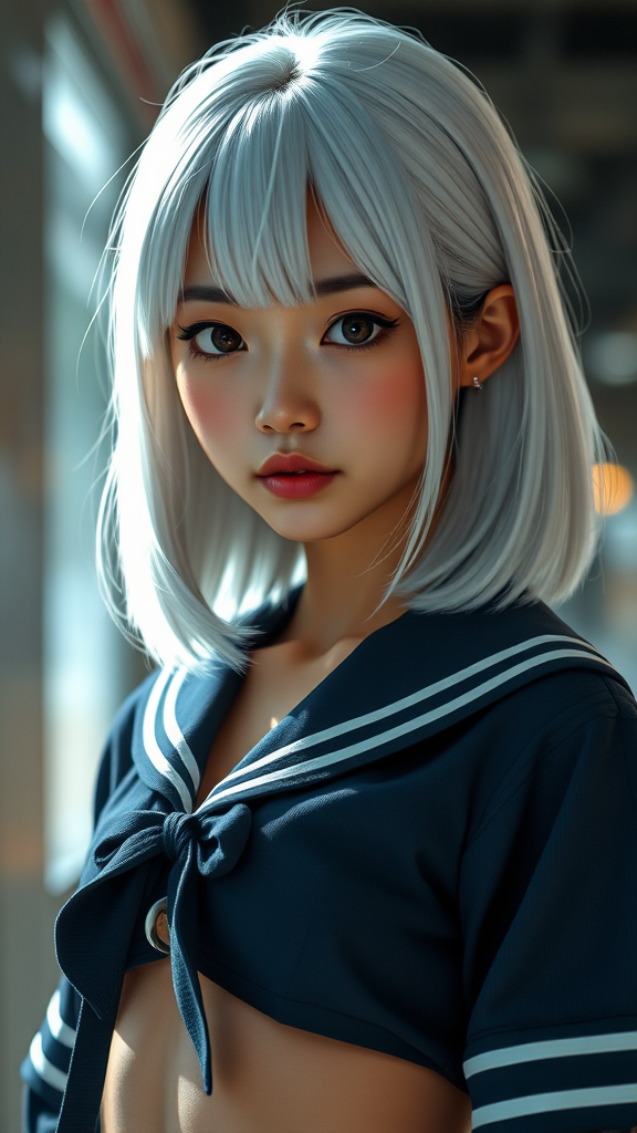 An exquisite Asian girl with striking white hair and captivating eyes, her olive skin glows under cinematic lighting. Her medium-length hair frames a flawlessly beautiful face. She has a toned physique adorned in a school girl uniform that subtly reveals her midriff. The scene is rendered in hyperrealism, capturing every detail in breathtaking 8k UHD, offering a mesmerizing, lifelike portrayal.