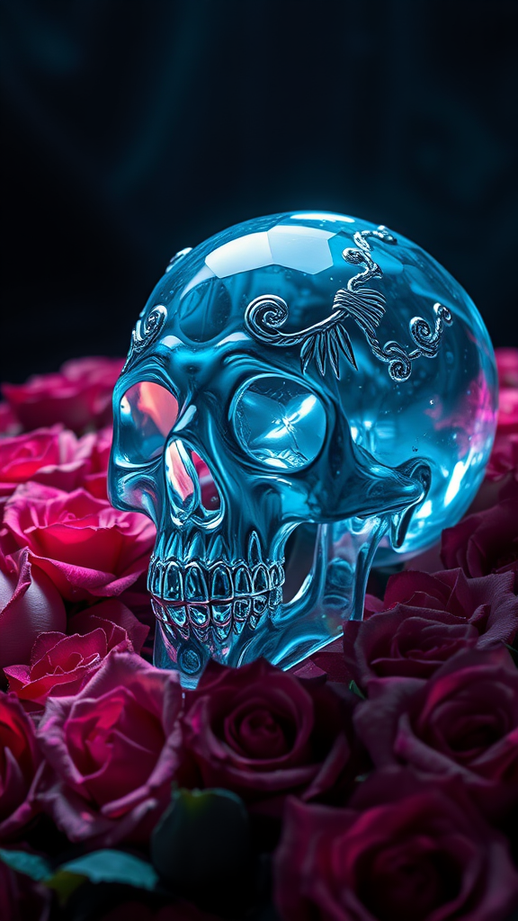 An exquisite crystal skull nestled amidst a bed of vibrant roses, exuding an aura of dark fantasy and ethereal magic. Captured in a breathtakingly epic shot, the scene is illuminated with cinematic lighting, creating a mesmerizing dance of shadows and gleams that highlight the skull's intricate details. The composition is richly ornate, reminiscent of Brian Froud's fantastical style. With an emphasis on extreme detail, the artwork captures the essence of fantasy art, presented in UHD, HDR, 8k resolution, inviting viewers into a realm of mystical wonder and elegance. The crystal's facets reflect bursts of color from the roses, adding layers of enchantment and mystery.