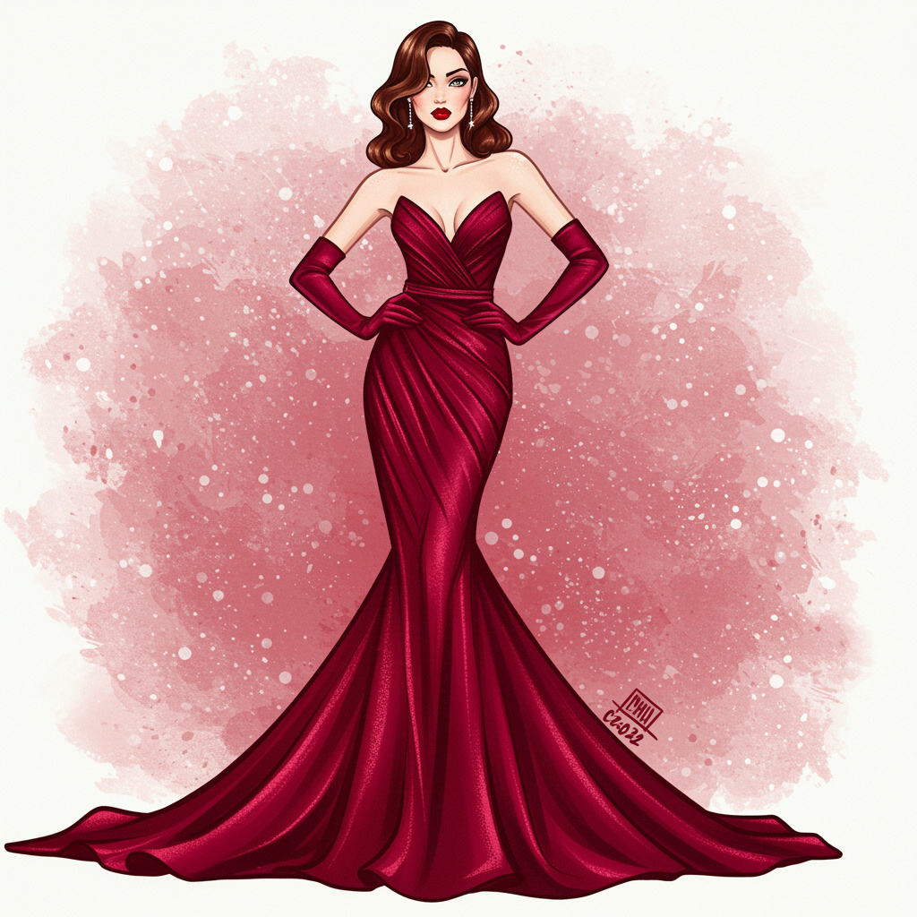 An exquisite fashion illustration of a captivating woman in a deep crimson gown. The gown is a striking and lively hue of crimson, instantly drawing the gaze of everyone nearby. She is portrayed with a poised and elegant demeanor, radiating an aura of assurance and sophistication. Her hair is styled in soft waves cascading around her face, with a touch of cherry red lipstick that seamlessly complements her ensemble. The illustration captures her in a full-body pose, emphasizing the gown's intricate design and her assured stance.