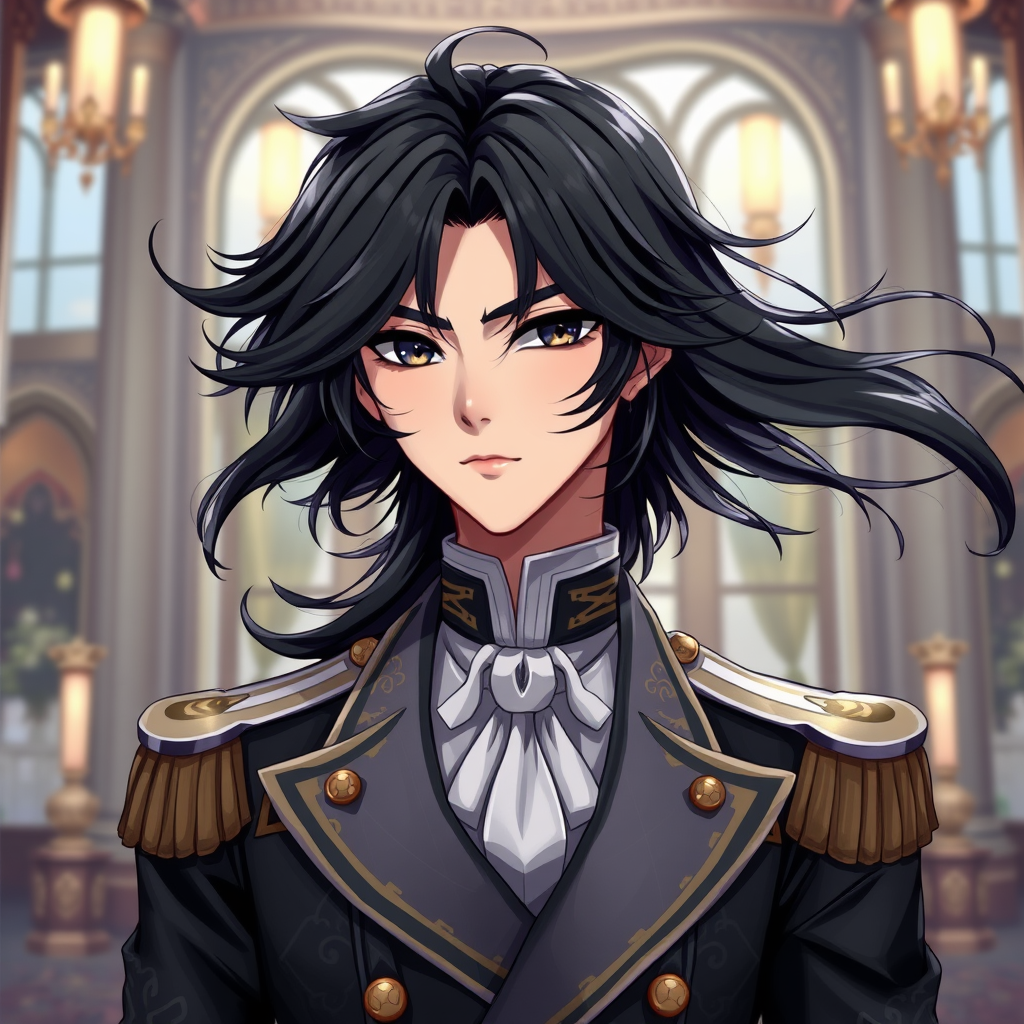 An exquisite illustration of a confident young gentleman, with flowing black hair and piercing dark eyes, embodying aristocratic elegance. Adorned in a meticulously detailed uniform, this handsome figure is 22 years old, exuding style and sophistication. The artwork is a masterpiece of unparalleled quality, showcasing flawless details and vibrant colors, set against the grandeur of a mansion backdrop. The scene is rendered in breathtaking 16k UHD HDR, capturing the dreamy and surreal essence of an animated fantasy.