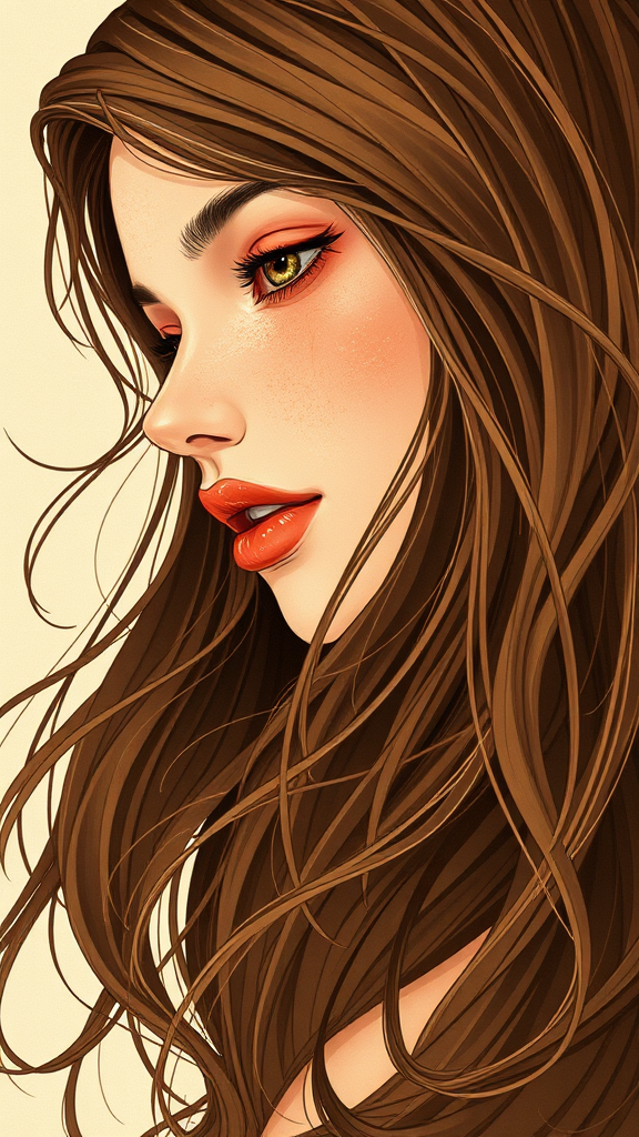 An exquisite illustration of a woman with flowing, cascading brown hair, captured in a style reminiscent of Ingrid Baars and J. Scott Campbell. The color palette is a harmonious blend of dark beige and light amber, highlighting her enchanting features. Inspired by Thiago Valdi, the illustration focuses on charming and captivating characters, emphasizing a close-up view. The composition is rendered in 8k resolution, maintaining a balance between realistic detail and stylized artistry, framed in a vertical format with a 73:112 aspect ratio, infused with a creative flair that brings a unique twist to the core concept.