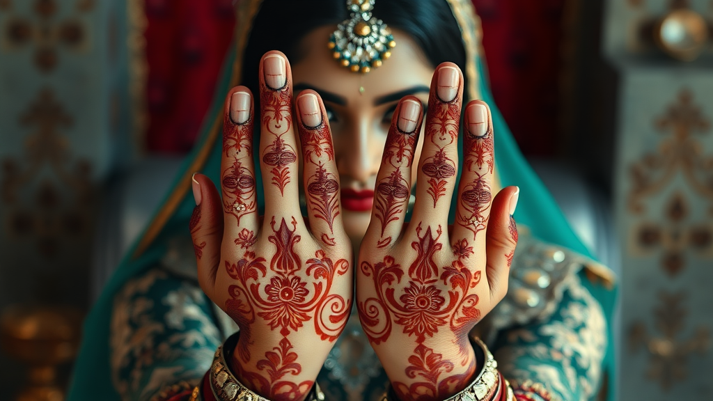 An exquisite Indian bride in opulent traditional attire reveals her intricately hennaed hands, capturing the essence of elegance in a photorealistic, ultra-detailed composition. The hyperrealistic portrayal, crafted through a wide angle lens and shot on 70mm film, showcases high-contrast shading and exquisite Indian-inspired motifs. The scene is awash with dark amber and rich emerald hues, accented by deep turquoise and warm brown tones, alongside vibrant mixes of orange with emerald and striking red beside emerald, complemented by the subtle clash of dark crimson and turquoise. The bride, encapsulated in high definition, radiates cultural sophistication.