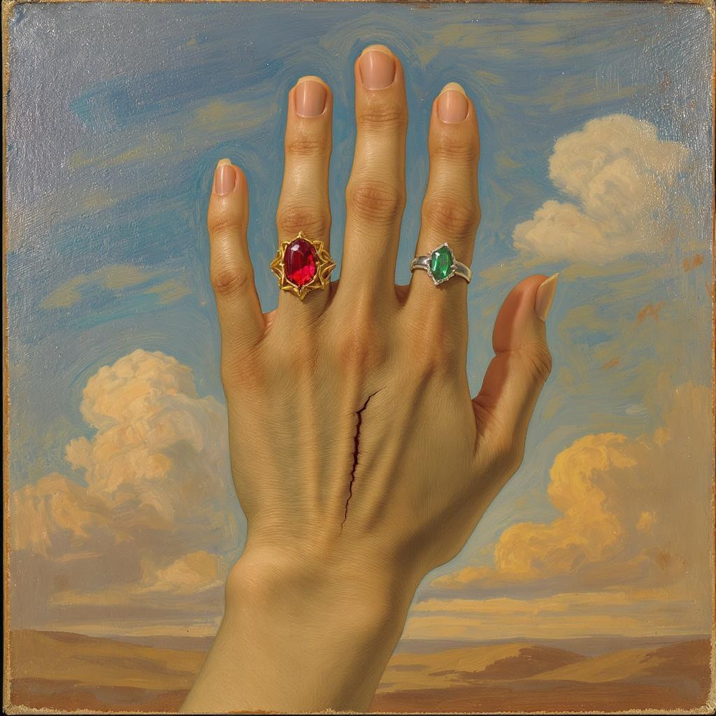 An exquisite oil painting depicting an aged hand adorned with an intricate gold ring featuring a striking red gem and another finger adorned with a sleek silver band encasing a vibrant green emerald. The fingers gracefully gesture toward the sky, revealing an ancient and deep scar etched into the skin, while the hand maintains its natural five-fingered form. Subtle variations in the skin texture and a play of light and shadows create a sense of timeless beauty and history.