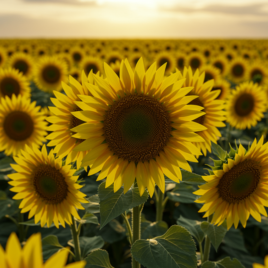 An exquisite sunflower bouquet captured in stunning detail, with a shallow depth of field emphasizing its vibrant colors against a vast sunflower field in the background. The portrait orientation showcases the bouquet's intricate textures, illuminated by cinematic lighting that casts a warm, golden glow. The hyper-realistic scene is rendered in 8K resolution, creating a true masterpiece that draws viewers into the idyllic landscape, where sunlight dances across the sunflowers, creating a mesmerizing play of light and shadow.