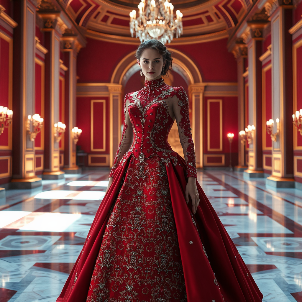 An exquisite vision of beauty, Anya Taylor-Joy graces the room in an opulent red gown fashioned from rubies and adorned with shimmering diamonds, each gem meticulously placed to highlight the dress's intricate details. This fashion masterpiece crafted from soft silk and luxurious brocade boasts a turtleneck design, embodying Victorian elegance within a futuristic, Sci-Fi great hall. The setting echoes a grand wedding photography scene, capturing her poised, full-body stance against the room's symmetrical lines. Ultra-realistic and cinematic lighting bathes her ethereal beauty, as seen through the lens of a Peter Mohrbacher-inspired vision. This scene embodies the essence of a fashion show where bridal glamour meets celestial artistry.