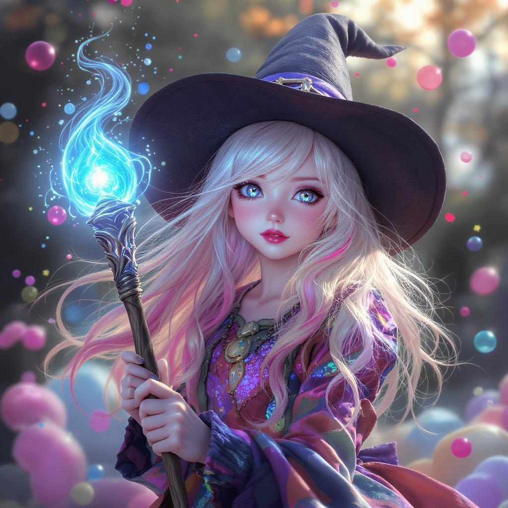 An exquisitely delicate and stunning masterpiece, featuring a solo illustration of a beautiful girl with ultra-detailed, realistic features. Her platinum hair flows like liquid, wildly disheveled, with vibrant streaks of color throughout. She wears a classic witch hat atop her head and holds a magical cane that glows with an ethereal light. Her eyes, a mesmerizing kaleidoscope of colors, shine with depth and curiosity. She is adorned in multicolored garments, shimmering in the sunlight, perfectly capturing the essence of Halloween. Surrounded by playful, colorful bubbles and splashes against a vivid background, the image radiates with high saturation and rich graphics, creating an enchanting and dreamlike atmosphere.