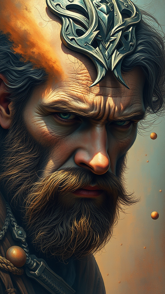 An exquisitely detailed and beautifully painted psychedelic portrait of a rugged male character from Dune, centered and intricate, combining styles reminiscent of Conrad Roset, Greg Rutkowski, and Makoto Shinkai, capturing a sense of atmospheric depth, cinematic realism, and vibrant color interplay, with subtle creative elements like a dust storm swirling in the background and a mystical light softly illuminating his face, conveying a sense of otherworldly grandeur and surreal intensity, trending on ArtStation.