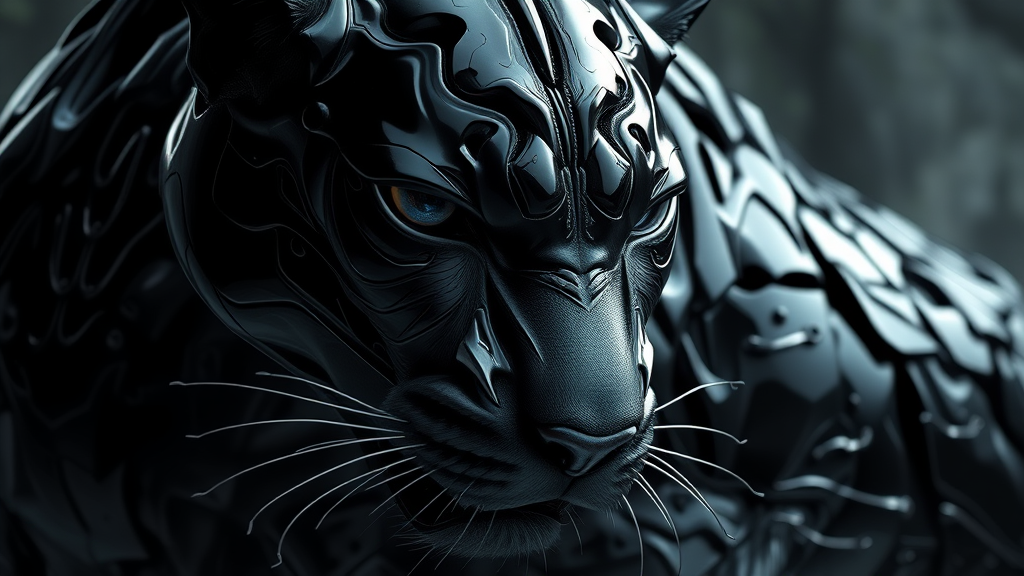 An exquisitely detailed depiction of a black panther encased in an intricate armor crafted from liquid metal, presented in a style reminiscent of fluid dynamics brushwork. The image showcases sleek, dark black hues complemented by sharp angles, capturing a close-up view. The scene embodies a mythical and transformative essence, accentuating the panther's sleek power and grace, enhanced by UE5 graphics. Razor-sharp details and slight abstract elements give a sense of constant motion and fluidity, with a harmonious blend of light reflections and shadow play.