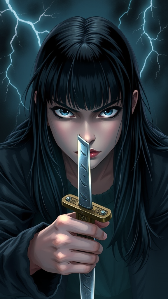 An exquisitely detailed digital illustration, high resolution, masterpiece quality, featuring a figure with long black hair and bangs, capturing a cowboy shot as they look directly at the viewer. The character has piercing black eyes and a grumpy expression, holding a short sword with a glare, depicted from above in a front view. The scene unfolds at night, enveloped in dark ambient lighting, evoking the mysterious aura of Wednesday Addams. Sporadic flashes of lightning illuminate the background, adding drama and intensity to the composition.