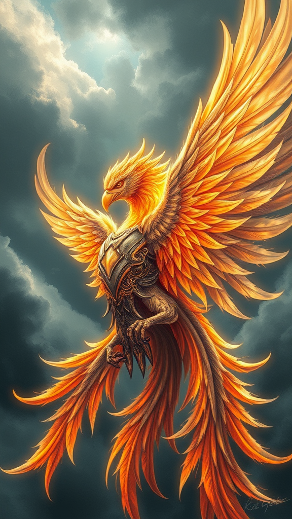 An exquisitely detailed drawing captures the essence of a majestic phoenix with luminous qualities, intertwining powerful human and mythical traits that evoke a sense of unparalleled strength and grace. Its intricate features defy reality, set against the dramatic backdrop of a stormy sky that highlights striking contrasts to elevate its ethereal beauty. Rendered in the iconic style of legendary artists like Julie Bell, the phoenix is adorned in elaborate celestial armor that enhances its fantastical allure. The artwork exhibits advanced hyperrealism, showcasing sophisticated lighting effects and expert color grading, rendered in breathtaking 4K/8K/16K gigapixel resolution for an unparalleled level of ultra-detailed realism, celebrating digital art at its finest.