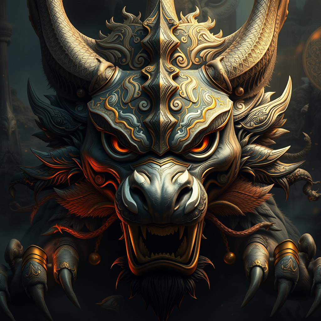 An exquisitely detailed image of a fierce singha, facing forward with intense expression, featuring intricate patterns and hyper-realistic textures. This mythical beast is surrounded by elements of Thailand's rich mythology, subtly intertwined with dragoncore aesthetics. The composition is both stunning and evocative of a dark fantasy world, echoing the artistry of Antonio J. Manzanedo. The atmosphere is imbued with deep shadows and mystical highlights, enhancing the singha's commanding presence in a visually arresting 4:5 aspect ratio.