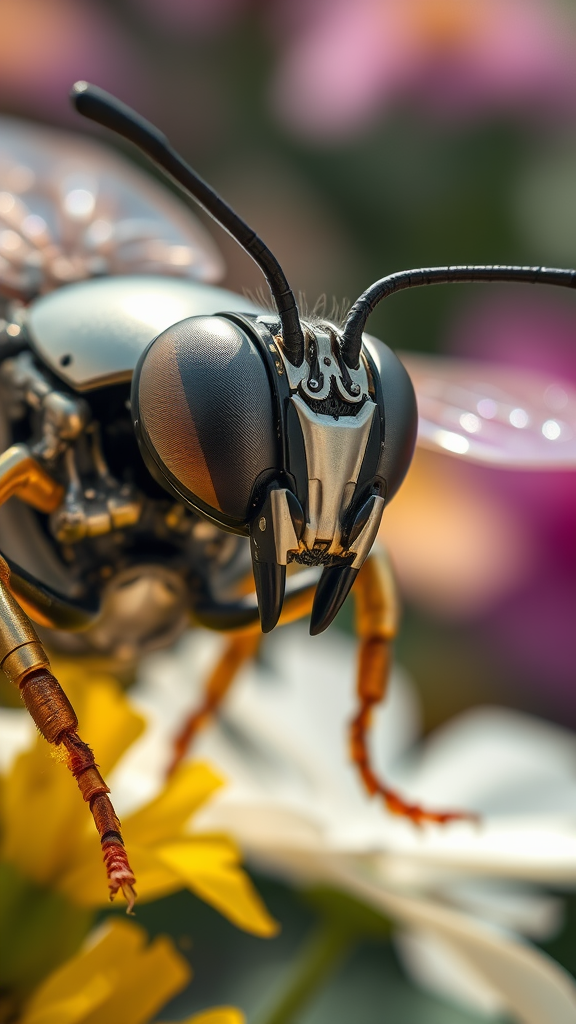 An exquisitely detailed macro photograph capturing the portrait of a highly advanced robotic bee, its sleek metallic body glinting in the light and its translucent wings displaying intricate engravings. The bee’s eyes are a complex mesh of tiny lenses, reflecting a spectrum of colors. Booted legs are slightly tarnished with vibrant yellow pollen, offering a striking contrast against its polished surface. The background is softly blurred, hinting at a lush garden in bloom, adding a touch of warmth and organic vibrance to this fusion of technology and nature.