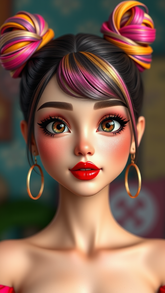 An extraordinarily adorable woman with vibrant top knots, exuding a sense of liveliness and charm. Her features are intricately detailed, with iridescent touches and striking red lipstick. Rendered with global illumination, she embodies both Pixar and Disney character aesthetics, as crafted by Artgerm. Her face is hyper-detailed, with clear, lifelike eyes and sharp focus. The rendering achieves an ultra-detailed 3D look with octane rendering and ray tracing techniques, presented in Ultra-High-Definition, 8k, HDR. She boasts a unique Dark Sushi Mix look with subtle artistic variations.