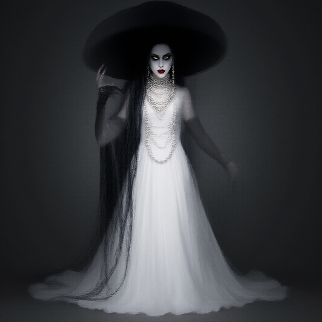 An extraordinary photoshoot features the villainess Alsina Dimitrescu, towering at a majestic nine feet tall. She boasts long, raven-black hair cascading down her back and piercing yellow eyes that gleam with an enigmatic allure. Her skin is a ghostly pale white, contrasting sharply with her dark, seductive red lipstick. Alsina dons a luxuriously lengthy white gown that billows dramatically, paired with sleek black gloves exuding elegance and menace. A large, black wide-brimmed hat casts an intriguing shadow over her face, while numerous strands of pearl necklaces add an element of aristocracy. This dark fantasy portrait captures the essence of bathorycore, inspired by the stylistic essence of the game Resident Evil, imagined in an evocative and expressive manner.