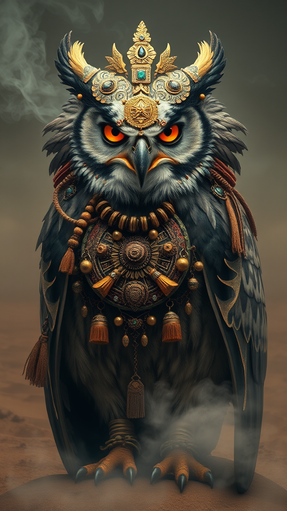 An extraordinary portrayal of an anthropomorphic eagle-owl shaman, ancient and wise, adorned with intricate trinkets and elaborate tribal adornments, exuding beauty and intricate detail, hypermaximalist in its opulence, luxurious and commanding an ominous presence. Shrouded in a mystical aura, smoke swirls around the atmospheric desert setting, creating a haunting yet captivating scene. The environment echoes the creativity of a matte painting, cinematic in scope, inspired by the artistry of cgsociety, with influences from Antonio J. Manzanedo, Vladimir Matyukhin, and Brian Froud. The eagle-owl's feathers shimmer with intricate patterns, and its eyes gleam with ancient knowledge, surrounded by the ethereal glow of a desert dusk.