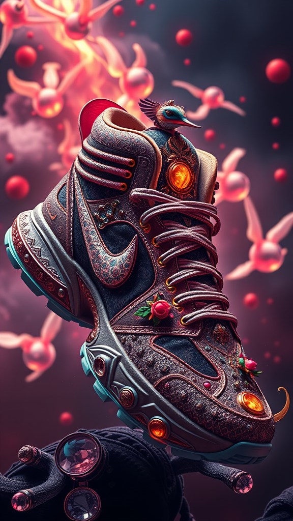 An extraordinary reimagining of a Nike sneaker, blending high fashion and intricate artistry, infused with hypermaximalist detail and opulent design, capturing the essence of luxury and cinematic flair. Inspired by the visionary styles of James Jean, Brian Froud, and Ross Tran, this concept delves into an imaginative world of ornate complexities and vibrant storytelling, showcasing the shoe as a masterpiece of modern art and design.