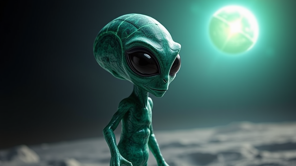 An extraterrestrial being composed of Velvet Malachite stands gracefully against the backdrop of its home planet, its two large glossy black eyes exuding a deep, soulful curiosity, while the distant celestial body glows softly in hues of green and blue, casting an ethereal light over the alien's textured, shimmering form.
