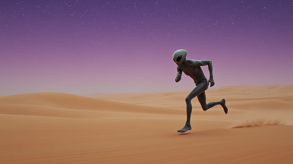 An extraterrestrial being resembling a human sprints across the vast desert landscape, their movements agile and swift, with a sleek mask shielding their features from the relentless sandstorms that sweep across the barren terrain, under a sky painted with hues of deep purple and scattered with unfamiliar stars.