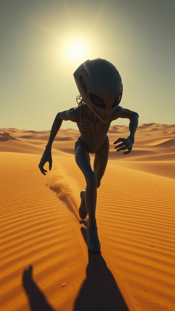 An extraterrestrial being with human-like features dashes across an endless desert landscape, its breath visible around the intricately designed mask that protects it from the harsh elements, while radiant sand dunes stretch endlessly beneath the blazing sun, casting long, shifting shadows.