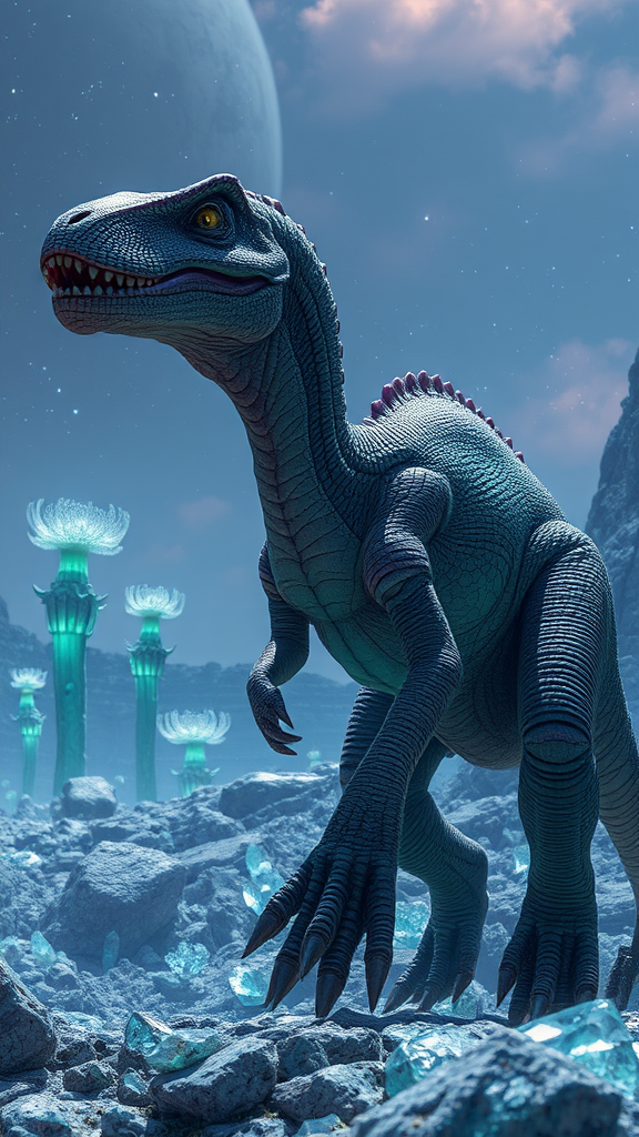 An extraterrestrial dinosaur in a towering, narrow frame emerges, its scales shimmering with hues of violet and emerald beneath a foreign, alien sky. Its eyes glow with an otherworldly intelligence, and its elongated limbs move gracefully over the crystalline terrain. The raw texture of its rugged skin reveals intricate patterns, resembling ancient runes, telling a story of its cosmic origin. In the distance, towering bioluminescent flora casts an ethereal glow, accentuating the dinosaur's regal, primal presence in this unearthly landscape.