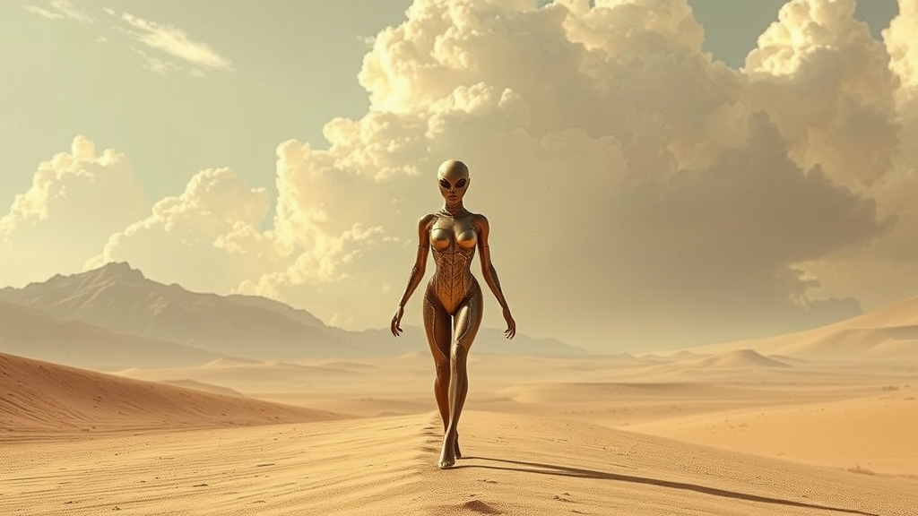 An extraterrestrial figure wanders through the arid landscape, embodying futuristic elegance in dark beige and shimmering gold. The scene is infused with a solar-punk vibe, emphasizing surrealistic poses beneath vast, captivating skies. This alien woman navigates the desert gracefully, her appearance echoing the intricate design of sophisticated spacecrafts. The composition features highly detailed, realistic figures, with a delicate play of light bronze and gold accentuating the low depth of field. Inspired by the imaginative style of craola, the atmosphere blends realism with an otherworldly charm, creating a mesmerizing vision.