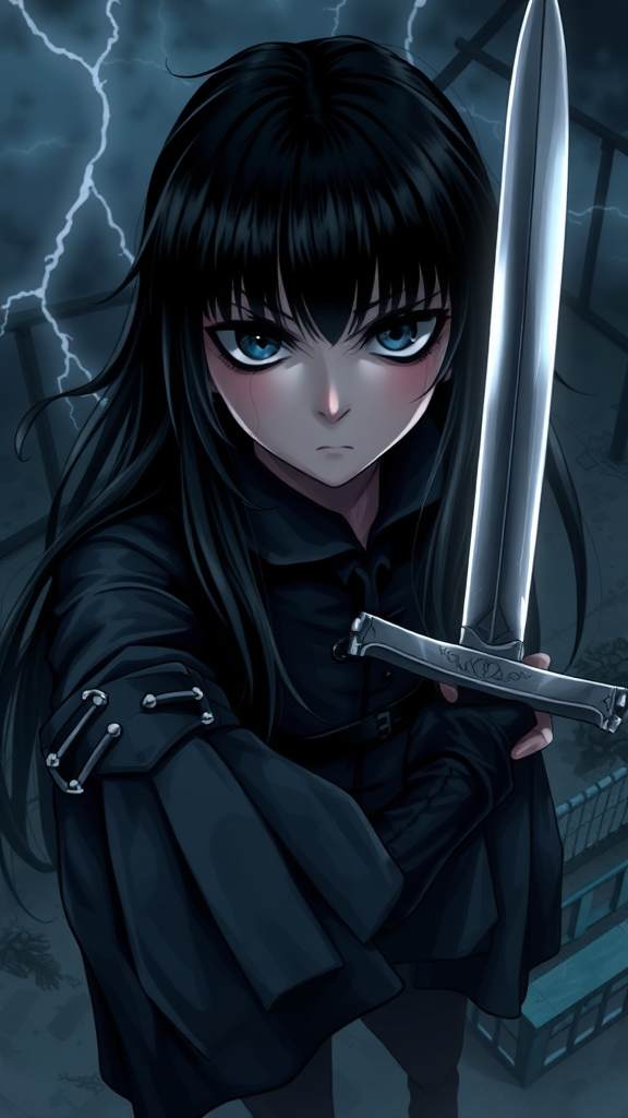 an extremely detailed digital illustration, high resolution, masterpiece, featuring a character with long black hair and bangs, wearing a dark cowboy-style outfit, looking directly at the viewer with black eyes and a grumpy, glaring expression. The character wields a short sword, captured from above in a front view composition, set against a night scene with dark ambient lighting. The atmosphere is reminiscent of a stormy night, with flashes of lightning illuminating the scene, drawing inspiration from wednesday addams with a touch of gothic elegance.