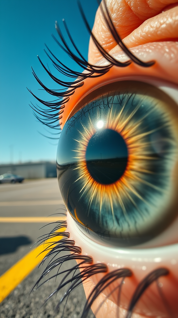 An eye captures the vivid reflection of a lowrider rhythmically bouncing with activated hydraulics, under clear blue skies above a parking lot, showcasing perfect anatomy in a photorealistic, highly detailed, macro-shot with 8k resolution and full wide focus. Poorly executed 3D models and unsatisfactory realism result in unattractive tiling and misshapen forms. The image suffers from elements being out of frame, extra limbs appearing disfigured and deformed, with blurred details and incorrect anatomy. The composition is marred by graininess, watermarks, unintentional signatures, and abrupt cropping, suggesting a draft-like quality.