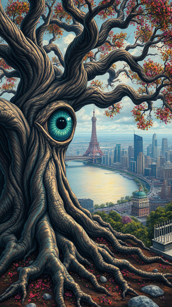An eye embedded within the gnarled branches of an ancient tree, its roots stretching towards a shimmering lake, reminiscent of Brian Despain's style with each detail painted meticulously as if dripping in vivid colors. The scene unfolds into an expansive landscape where the surrealistic urban skyline emerges, a fusion of Mars Ravelo's vibrant storytelling and Mati Klarwein's intricate dreamscapes, evoking a world where reality bends and imagination reigns.