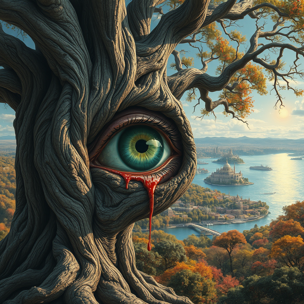 An eye embedded within the gnarled trunk of an ancient tree by a shimmering lake, rendered in the style of Brian Despain, where paint drips languidly from its branches into the water below. The scene is set against expansive landscapes, blending nature with surrealistic urban elements reminiscent of Mars Ravelo's storytelling and Mati Klarwein's intricate detail. Dreamlike cityscapes stretch across the horizon, merging fantastical architecture with vivid foliage, as if Mars itself has come alive in a narrative of color and depth.