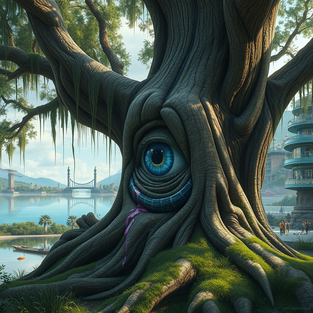 An eye nestled within the bark of an ancient tree by a serene lake, adorned with cascading streaks of paint. The setting opens up to expansive landscapes, merging the natural with surreal urban elements. Highly detailed scenes reveal a blend of imaginative architecture and lush greenery, inspired by the styles of Brian Despain, with hints of Mars Ravelo’s storytelling and Mati Klarwein’s vibrant surrealism, evoking a sense of mystery and wonder.