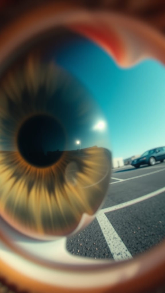 An eyeball captures the reflection of a lowrider, its hydraulics bouncing under a clear blue sky in a parking lot; the image is a macro shot, photorealistic, vividly detailed, and presented in 8k full wide focus. Despite these elements, the portrayal is marred by poorly executed 3D renderings, resulting in an unattractively realistic interpretation. The scene features tiling issues, elements drawn clumsily and out of frame, and characters with extra limbs or deformed anatomy. The image is further compromised by blurriness, grainy filters, unwanted watermarks, and signatures, along with parts that appear cut off or left in a draft state, disrupting the visual coherence.