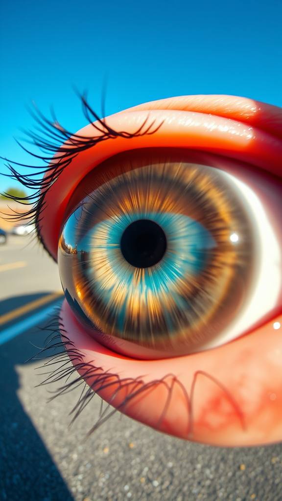 An eyeball captures the vivid reflection of a lowrider pulsating with activated hydraulics under clear blue skies in a parking lot. The scene boasts perfect anatomy with a macro-shot, photorealistic, highly detailed 8k full wide focus, yet is juxtaposed with elements of poorly constructed 3D, unattractive realism. This composition is marked by tiling issues, blurry lines, and anatomy that seems slightly off. There are distorted elements, unwanted graininess, and an inelegant, unfinished quality with parts that appear out of frame or cut off.