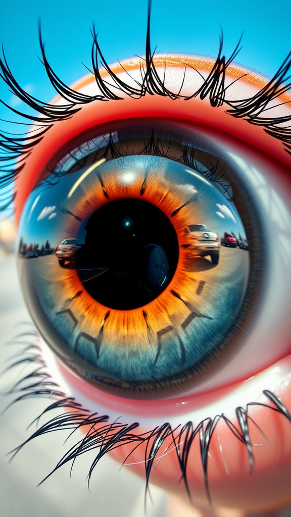An eyeball displays a reflection of a lowrider in motion, hydraulics bouncing amidst clear blue skies over a parking lot. The scene is a macro-shot, photorealistic, highly detailed, perfect anatomy, 8k full wide focus capturing intricate details. However, the image is accompanied by poorly constructed 3D elements, creating an unintentional juxtaposition with realistic features. The background includes aspects that are flawed, such as tiling, multiple limbs, disfigurements, and blurred, out-of-frame elements. It features bad anatomy, a grainy texture, and is partially obscured by an unfinished draft quality, with visual noise like watermarks or signatures interrupting the scene.