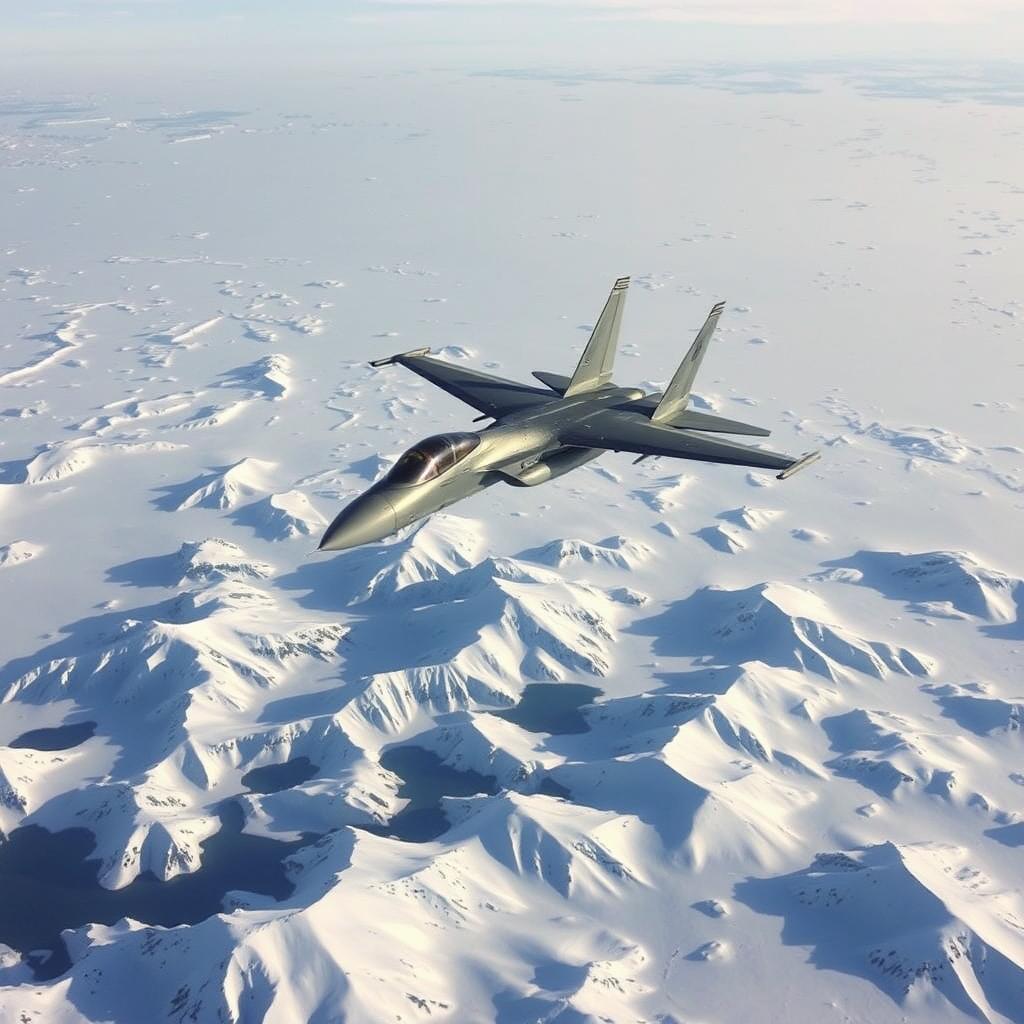 An F-15S/MTD streaks across the vast expanse of the tundra, its powerful engines roaring against the backdrop of icy wilderness. Below, the snow-dappled landscape stretches endlessly, interrupted only by jagged ridges and frozen lakes, glistening like shards of glass under the pale sun. As the jet maneuvers with unmatched agility, its shadow dances over the barren terrain, a fleeting specter amidst the timeless solitude of the Arctic world.