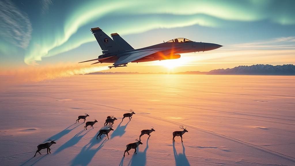 An F-15S/MTD streaks across the vast, frozen expanse of a tundra, its sleek form cutting through the icy winds as the sun casts a golden glow on the endless white landscape below. Aurora borealis flicker in the sky, painting the background with ethereal colors. The jet's afterburners leave a trail of misty vapor, which briefly sparkles like a thousand tiny diamonds in the crisp, chilling air. Below, herds of caribou can be seen moving in sync, undisturbed by the machine roaring above, while in the distance, ancient, snow-capped mountains stand sentinel under the northern sky.