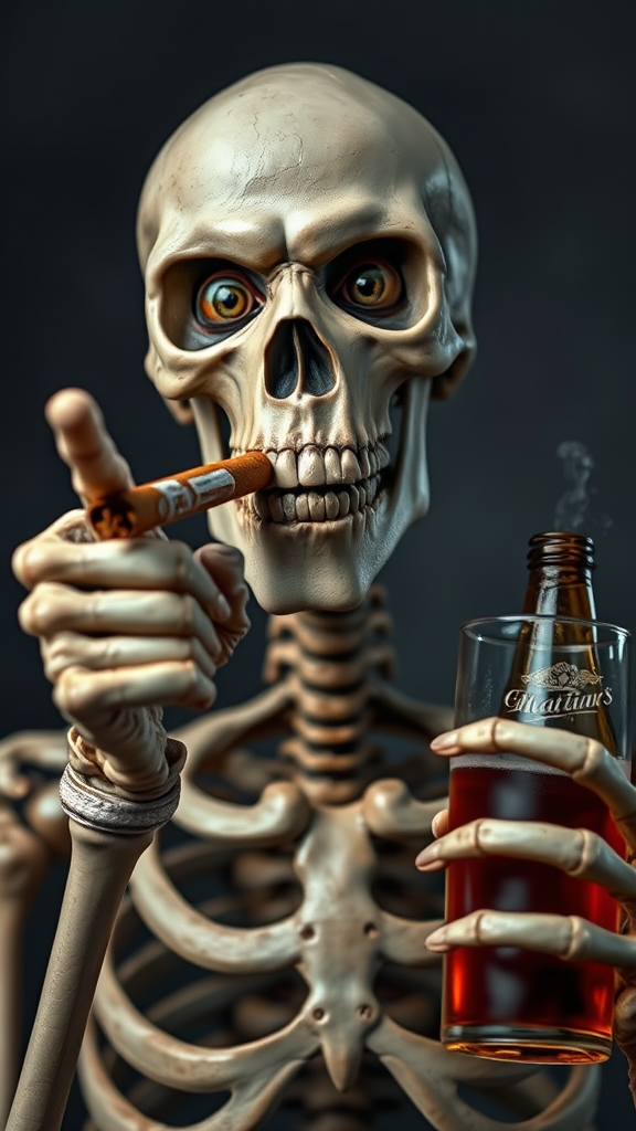 An HD image of a human skeleton with a cigar in its mouth, locking eyes with the viewer while pointing directly at them. The skeleton is also holding a beer in one hand. The hands are human-like, with skin and flesh, but noticeably feature extra fingers and mutated shapes. Its eyes have deformed irises and pupils, appearing cross-eyed and off-kilter. The face has a cloned appearance, emphasizing the skeletal aspect with a peculiar grin. The overall image is in 16k UHD with HDR, highlighting the imperfections such as jpeg artifacts and low-res sections. The frame is cropped, cutting off parts of the long neck, conveying a slightly distorted and off-balance composition. There are no text elements, signatures, watermarks, or artist names visible.